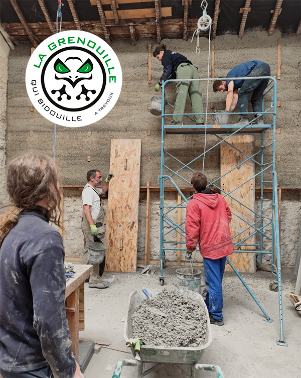 🚧 Le chantier : venez apprendre et pratiquer autour de techniques traditionnelles. Transmission des savoir-faire : béton de chanvre, armatures bois, sur murs en pisé et pierres…